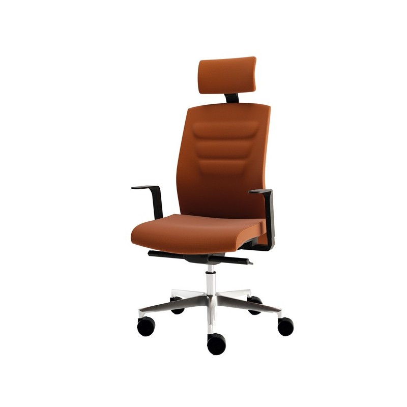 Poltrona direzionale girevole con elevazione a gas e poggiatesta- meccanismo synchro con 4 blocchi anti shock - base alluminio pressofuso. Rivestimento seduta in tessuto "PLUS - Eco leather" PES 20% PVC 79% PU 1% idrorepellente, facile da pulire, senza flatati e flame retardant. Completa di braccioli regolabili. Alt.tot.: 129 - 139cm; Prof.tot.: 70cm; Alt.schienale: 87cm; Larg.schienale: 48cm; Larg.seduta: 48cm; Prof.Sedile: 47cm; Altezza sedile: 42 - 54cm.