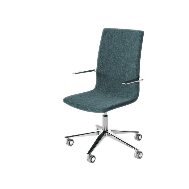 Poltrona direzionale girevole con elevazione a gas - meccanismo oscillante con 4 blocchi - base alluminio. Rivestimento seduta in tessuto "SUPER - King L" 100% TREVIRA reazione al fuoco classe 1. Completa di braccioli fissi. Alt.tot.: 100 - 112cm; Prof.tot.: 70cm; Alt.schienale: 61cm; Larg.schienale: 50cm; Larg.seduta: 51cm; Prof.Sedile: 44cm; Altezza sedile: 45-57cm.