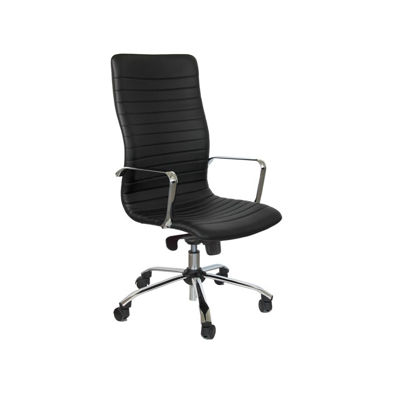 Poltrona direzionale girevole - sedile e schienale in multistrati di legno - elevazione a gas - meccanismo oscillante con blocchi - base e braccioli in acciaio cromato. Rivestimento seduta in tessuto "PLUS - Eco Leather" idrorepellente, facile da pulire, senza flatati e flame retardant. Braccioli inclusi (non rimovibili). Alt.tot.: 108-117cm; Prof.tot.: 70cm; Alt.schienale: 66cm; Larg.schienale: 50cm; Larg.seduta: 50cm; Prof.Sedile: 48cm; Altezza sedile: 44-54cm.