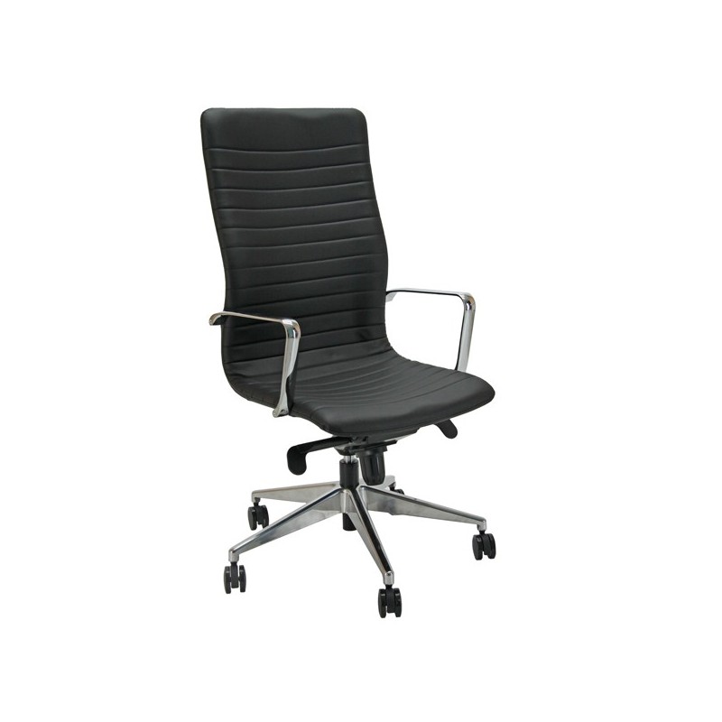 Poltrona direzionale girevole - sedile e schienale in multistrati di legno - elevazione a gas - meccanismo oscillante con blocchi - braccioli in acciaio cromato e base in alluminio. Rivestimento seduta in tessuto "PLUS - Eco Leather" idrorepellente, facile da pulire, senza flatati e flame retardant. Braccioli inclusi (non rimovibili). Alt.tot.: 108-117cm; Prof.tot.: 70cm; Alt.schienale: 66cm; Larg.schienale: 50cm; Larg.seduta: 50cm; Prof.Sedile: 48cm; Altezza sedile: 44-54cm.