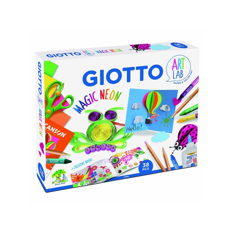 Kit creativo per giocare con la carta e i colori. Il kit contiene tutto l'occorrente per la realizzazione di biglietti di auguri, cartoline pop-up e quilling art: 12 Giotto cera bicolore, 4 Giotto pastelli Di Natura colori fluo, 1 Giotto colla Collage ?acone 120g, 1 paio di forbici, 20 fogli blocco CANSON A4 in 4 colori ?uo assortiti, 1 guida creativa.