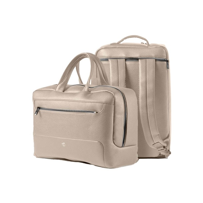 Borsa a due manici trasformabile in zaino. Tasca porta pc, tasca porta tablet, tracolla con salvaspalla imbottito, tasca anteriore con alloggiamenti vari, doppio soffietto porta documenti, tasca posteriore con maniglia per trasporto su trolley.