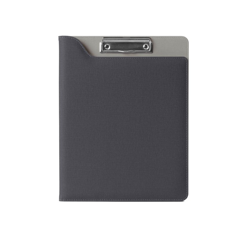 Cartella portablocco dotata di molla in metallo per blocchi A4. Copertina frontale antiscivolo. Dotata di aletta portadocumenti, scomparto per biglietti e asola portapenne.