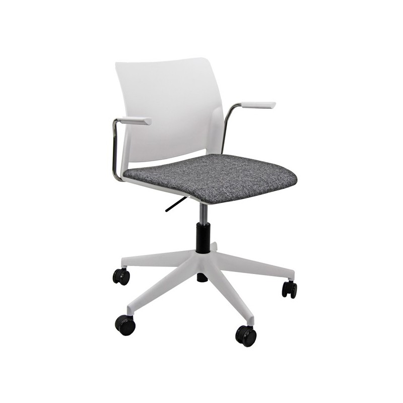 Seduta interlocutore 100% polipropilene girevole su ruote - elevazione a gas. Completa di braccioli. Rivestimento sedile in tessuto " SUPER - Expo" 100% poliestere e reazione al fuoco classe 1. Alt. tot: 81-92cm; Prof.tot: 62cm; Alt.schienale: 36cm; Largh.schienale: 48cm; Largh. sedile: 50cm; Prof.sedile: 44cm; Alt.sedile: 44-55cm. Certificazioni: EN 16139: 2013.