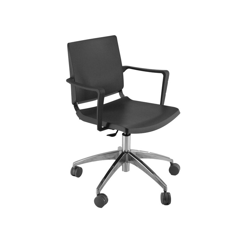 Poltroncina girevole con braccioli inclusi - elevazione a gas- base allumino lucido - 100% polipropilene. Alt. tot: 77-91cm; Prof.tot: 62cm; Alt.schienale: 39cm; Largh.schienale: 39cm; Largh. sedile: 45cm; Prof.sedile: 45cm; Alt.sedile: 44-67cm.