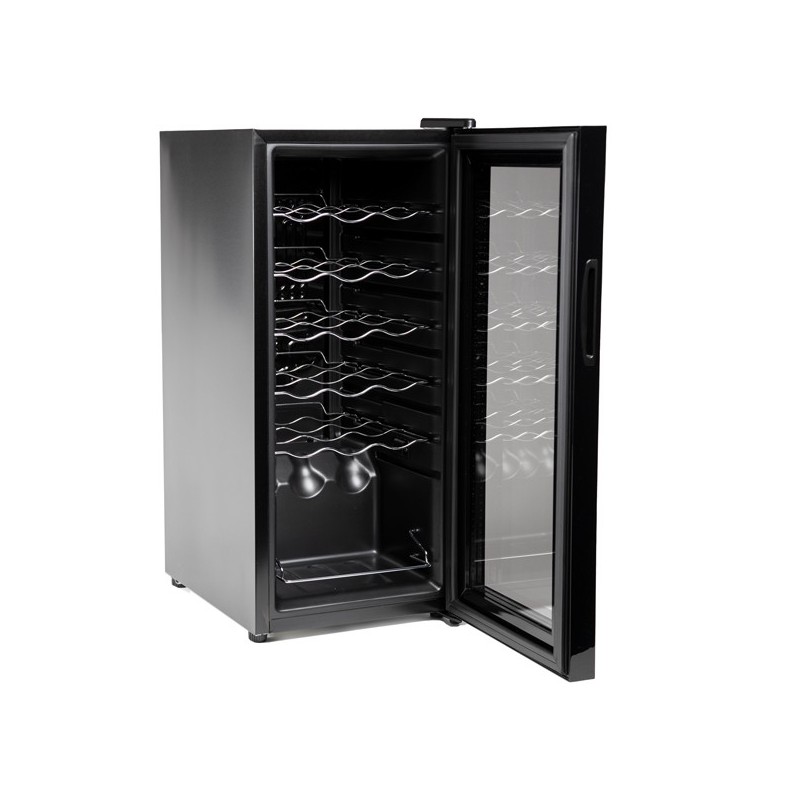 Cantinettà con capacità: 18 bottiglie/ 50 litri. Sistema di raffreddamento con compressore. Luce interna a LED con autospegnimento dopo 10 minuti, che garantisce un risparmio energetico e consente una limitata produzione di calore per una migliore cura delle bottiglie. Regolazione della temperatura: 5-18°C. Comandi soft touch. Porta in vetro temperato con filtro anti UV con protezione dai raggi ultravioletti. Rumorosità: 43 dB. Ripiani cromati. Piedini regolabili. Auto-defrost. CLASSE G. Alimentazione: 220-240V ~ 50Hz. Potenza: 70W.Colore: nero. Dimensioni :34,5x45x77cm