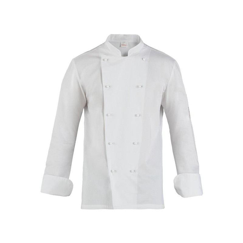 Giacca da cuoco a manica lunga con abbottonatura doppio petto, collo e polsi arrotondati, porta penne sulla manica sinistra. Vestibilità Slim Fit e bottoni estraibili sulla pettorina davanti. Realizzata in tessuto 100% cotone nella variante bianca. Ha la variante manica corta nella giacca Tommaso. Taglie: XS, S, M, L, XL, XXL, 3XL, 4XL, 5XL