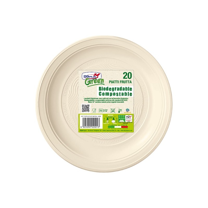 Piatti color avorio realizzati in Mater-Bi compostabile. Non Idonei per essere usati in forno; adatti in microonde max 500W per 2 minuti. Idonei al contatto con gli alimenti. Per alimenti Max 70°C.