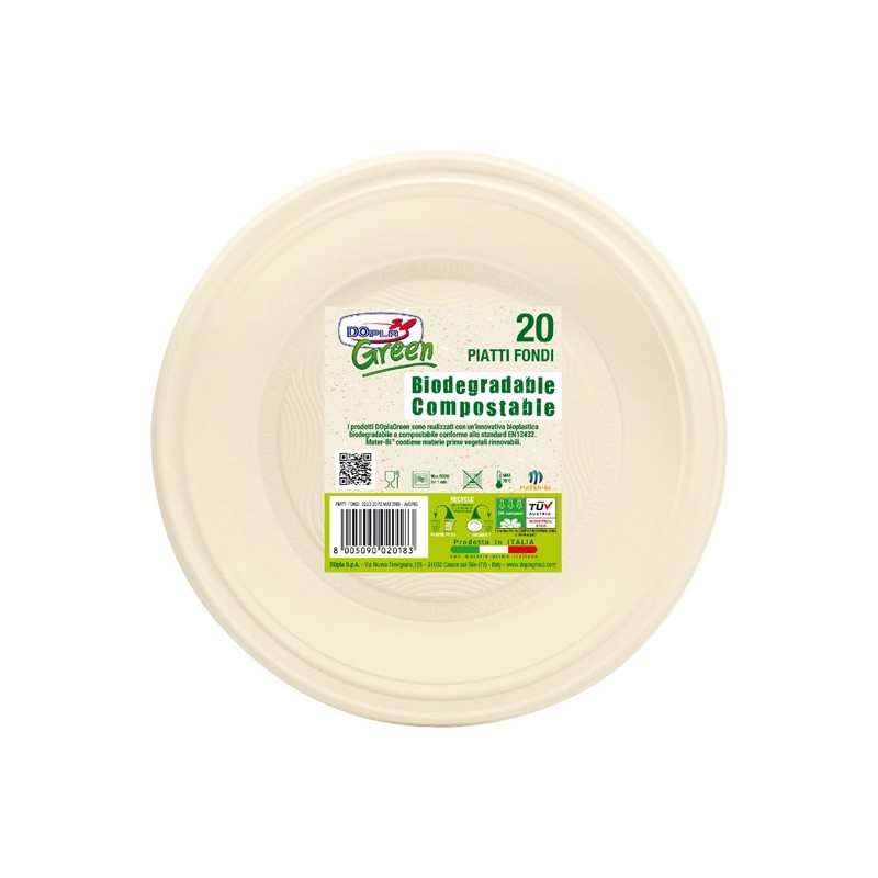 Piatti color avorio realizzati in Mater-Bi compostabile. Non Idonei per essere usati in forno; adatti in microonde max 500W per 2 minuti. Idonei al contatto con gli alimenti. Per alimenti Max 70°C.