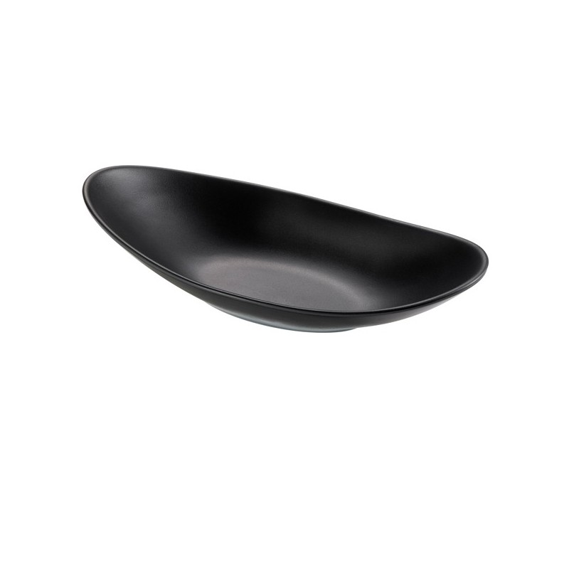 Piatto ovale in melamina nera, 31x16x4 cm. Peso netto 291gr. Capacità: 650ml. Colore Nero. 100% Melamina, prodotto idoneo al contatto con tutti i tipi di alimenti (T max70°C). Articolo lavabile in lavastoviglie; Da non utilizzare con utensili taglienti. Prodotto da non utilizzare unitamente all'alimento nel forno tradizionale e forno a microonde; Conservare il prodotto in luogo asciutto,lontano dai raggi del sole e fonti di calore(0°C+35°C).