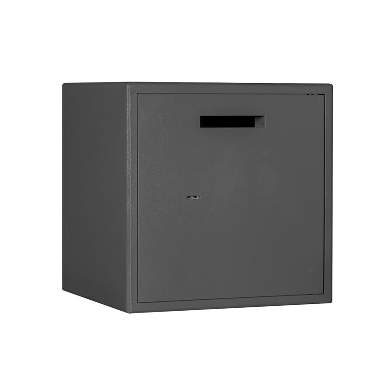 Ideale per uffici e negozi per inserire l’eccesso di cassa. Nuovo sistema anti-ripescaggio. Chiusura con serratura a chiave, 2 chiavi in dotazione; Apertura porta a 90° mediante cerniere interne; Chiusura con catenacci sui 1 lato. Di serie predisposto per l'ancoraggio al suolo, comprensivo di materiale per l'ancoraggio. Colore: RAL 7024 (Grigio scuro)