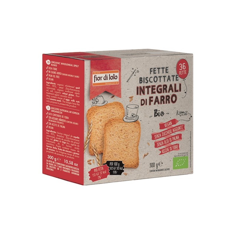 Confezione da 36 fette biscottate integrali al farro, biologiche e senza zuccheri aggiunti. Confezione da 300gr.