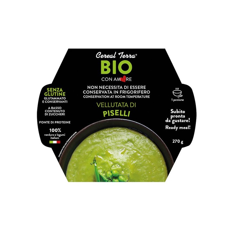Vellutata di piselli senza conservanti con verdure e legumi italiani. Ingredienti: Piselli* 46%, acqua, cipolla*, olio extravergine di oliva*, sale marino. *BIOLOGICO