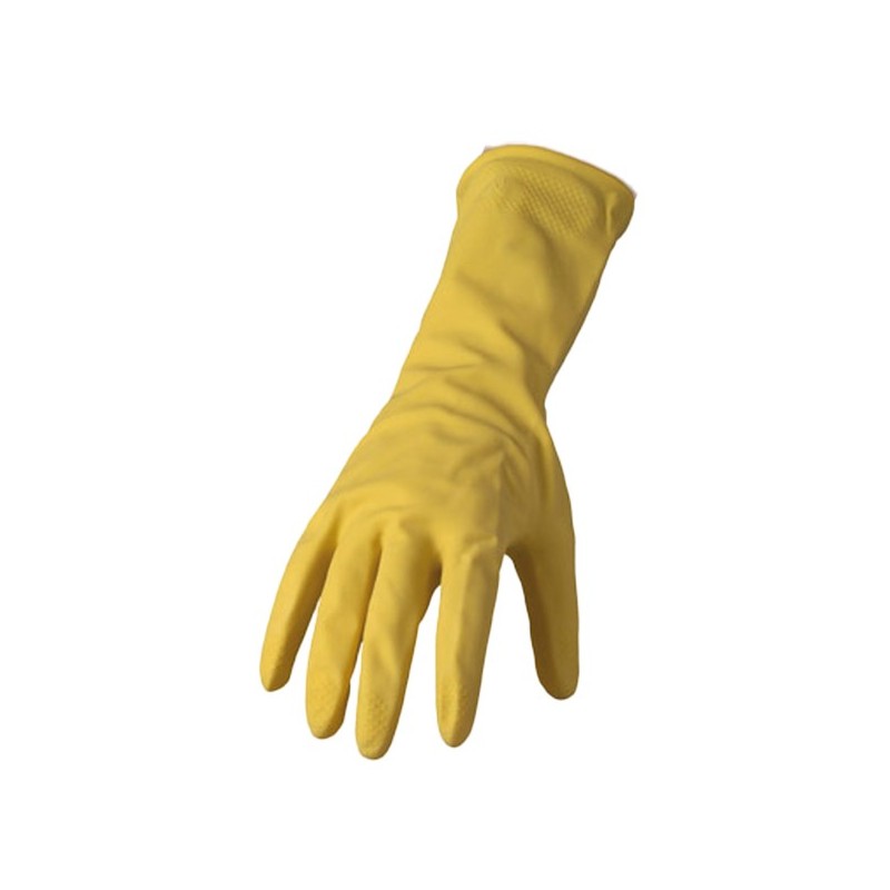 Guanti felpati in lattice con bordino antigoccia. Zigrinatura antiscivolo. Felpatura interna in cotone. Colore giallo.