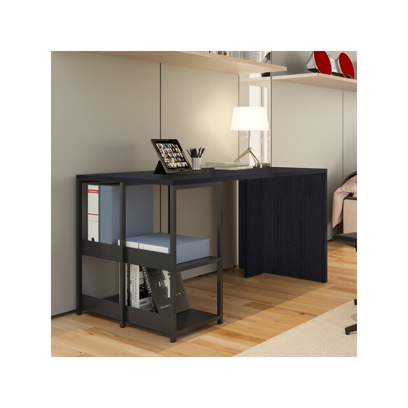 Postazione di lavoro home-office ideale per lo smart working. Le dimensioni compatte la rendono idonea per un allestimento domestico anche in ambienti con poco spazio a disposizione. Estrema versatilità grazie alla possibilità di allestire la robusta struttura metallica che sorregge il desktop sia sulla destra che sulla sinistra dello stesso. Design minimal e stile nordico industriale si fondono in un equilibrio perfetto fra semplicità e funzionalità. Desktop (L140 x P69 cm) e fianco in nobilitato melaminico sp. 22 mm conforme alle norme UNI e EN classe E1. Struttura metallica L69 P35 H70,2 cm con tre montanti sezione 20x20 mm e due ripiani. L’altezza utile del ripiano inferiore è di 28,1 cm, mentre quella del ripiano superiore è di 37 cm sotto il desktop e 35 cm in corrispondenza dei tre montanti. Dimensioni complessive in cm: 140x6 x72,4h. Struttura in metallo nero opaco.