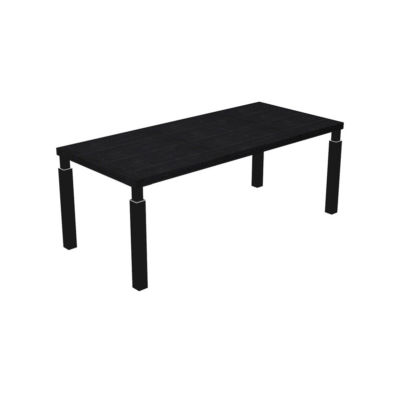 Scrivania direzionale con quattro gambe in metallo a sezione quadrata complete di piedini regolabili in altezza per un perfetto livellamento. Le gambe hanno sezione 70x70mm sul fusto e 40x40 mm nella parte alta e si agganciano al desktop ognuna con una robusta piastra metallica. Desktop (sp. 38 mm) con bordo antiurto in ABS (sp. 3 mm). Le gambe, in entrambe le versioni di colore, sono impreziosite da dettagli e particolari cromati.
