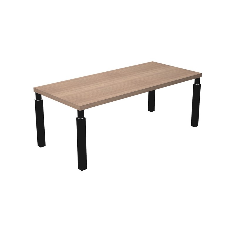 Scrivania direzionale con quattro gambe in metallo a sezione quadrata complete di piedini regolabili in altezza per un perfetto livellamento. Le gambe hanno sezione 70x70mm sul fusto e 40x40 mm nella parte alta e si agganciano al desktop ognuna con una robusta piastra metallica. Desktop (sp. 38 mm) con bordo antiurto in ABS (sp. 3 mm). Le gambe, in entrambe le versioni di colore, sono impreziosite da dettagli e particolari cromati.
