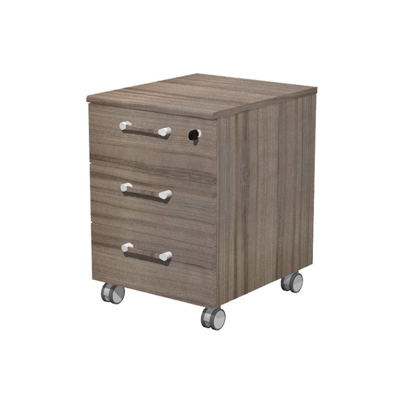 Cassettiera a 3 cassetti (sp. 18 mm) completa di serratura, ruote girevoli e guide metalliche con fermo a fine corsa. Il retro della cassettiera è rifinito nello stesso colore della struttura.