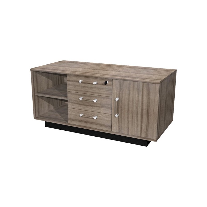 Versatile mobile di servizio completo di due vani a giorno, 3 cassetti (il primo con serratura – dimensioni utili: L34xP38,8xH12cm) e ulteriori due vani chiusi da un’antina (dimensioni utili di ogni vano: L36,7xP51xH21,6cm). Reversibile destro o sinistro (sp. 18 mm). Dimensioni:120x55x56,6Hcm Colore noce toscano