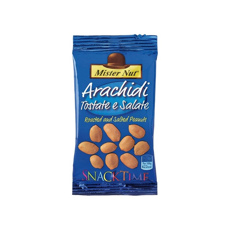 Frutta secca tostata e salata. Ingredienti: Arachidi (96%), Olio di arachide, Sale. Può contenere tracce di frutta a guscio (Anacardi, Mandorle, Noci, Nocciole, Pistacchi)