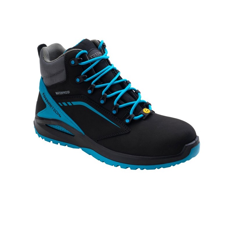 Calzatura in pelle di colore nero con membrana interna traspirante ed impermeabile, con applicazioni di colore azzurro ottanio. Fodera interna R-DRY antiodore di colore grigio ed azzurro ottanio, linguetta imbottita, puntale in fibra di vetro, lamina non metallica, soletta anatomica, traforata, con gel antishock sul tallone che assorbe gli urti, estraibile, traspirante ed antistatica. Sistema R-FRESH che favorisce il ricircolo d’aria e mantiene il piede asciutto. Suola antiscivolo in poliuretano bidensità.