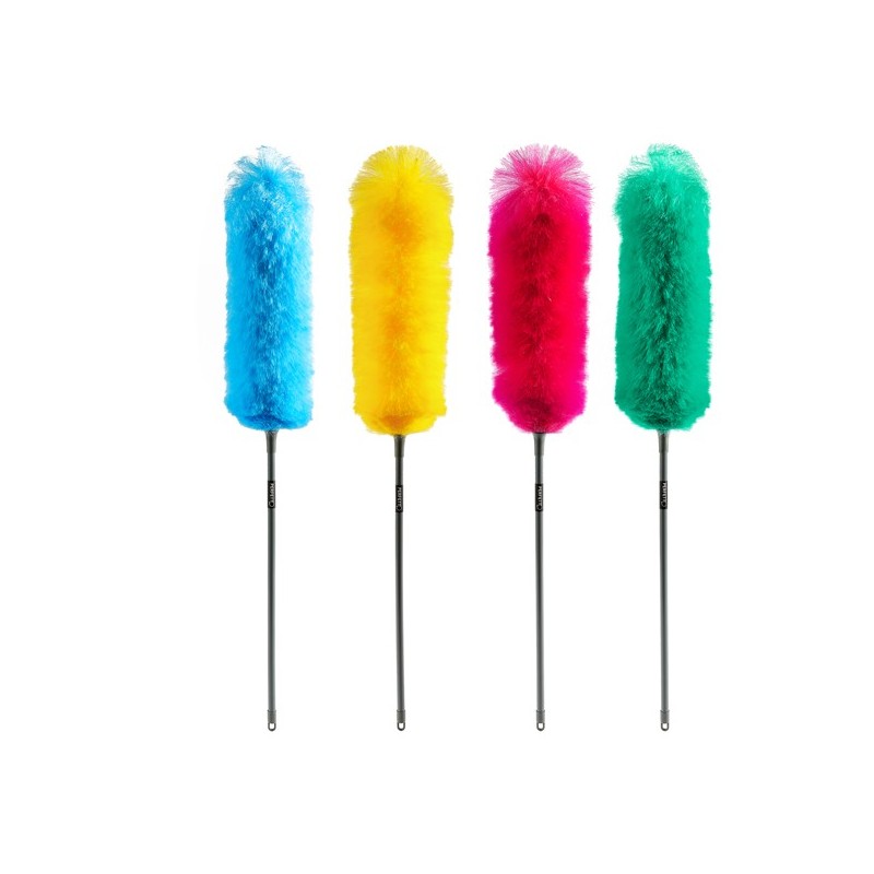 Piumino raggiungi-polvere elettrostatico, maneggevole, pieghevole. Extralungo, contro la polvere più alta. Fibra e manico: 100% polipropilene. Struttura: 100% metallo. Dimensioni: Ø5X105 cm. Colori assortiti: giallo, verde, fuxia e azzurro.
