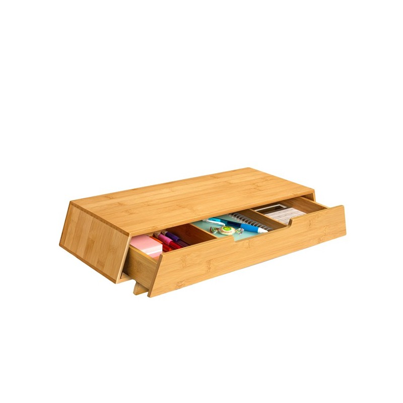 Porta schermo in Bambù e organizer da scrivania. Nessun assemblaggio richiesto. Una vernice protettiva rende il prodotto impermeabile. 100% bambù naturale. Riciclabile al 100%.Prodotto certificato FSC. Dimensioni: L53xP20xH12cm