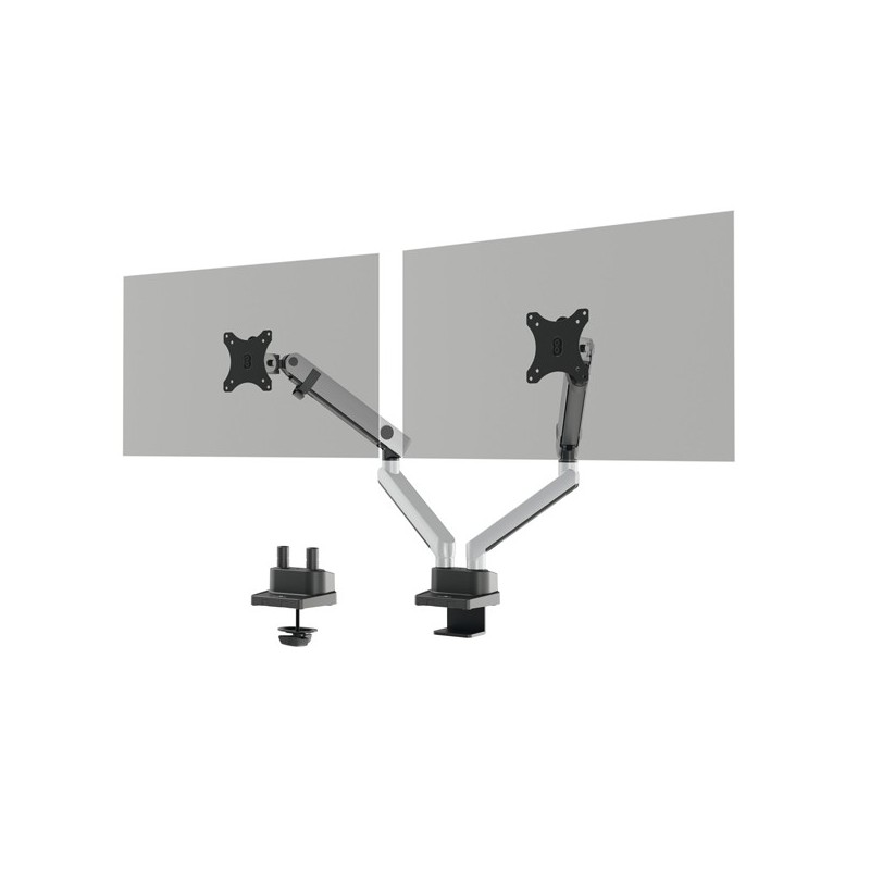 Braccio porta monitor per 2 monitor standard fino a 32" e fino a 8 kg. Fissaggio tramite morsetto o perno per foro passacavo (entrambi inclusi nella confezione). Altezza, inclinazione e orientamento del monitor regolabili facilmente e individualmente per un lavoro ergonomico. Supporto universale VESA (75 x 75 mm o 100 x 100 mm). Facile installazione del monitor grazie al meccanismo ad innesto. Braccio dotato di molla meccanica che stabilizza il monitor. Gestione dei cavi: il cavo del monitor è guidato lungo il supporto da una canalina interna e una clip passacavo, proteggendolo così dalla rottura. Il monitor può essere ruotato di 90° per lavorare in modalità verticale o orizzontale (con meccanismo di bloccaggio). Monitor direzionabile di 180° (+90°/-90°). Il monitor può essere inclinato di 180° (+90°/-90°). Fissaggio con morsetto o perno per foro passacavo: per scrivanie da 10-50 mm. Materiali: alluminio, acciaio e plastica.