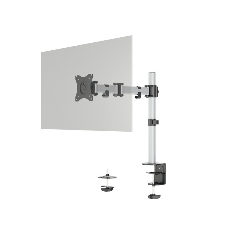 Braccio porta monitor per 1 monitor standard fino a 27" e fino a 8 kg. Fissaggio tramite morsetto o perno per foro passacavo (entrambi inclusi nella confezione). Altezza, inclinazione e orientamento del monitor regolabili facilmente e individualmente per un lavoro ergonomico. Supporto universale VESA (75 x 75 mm o 100 x 100 mm). Gestione dei cavi: il cavo del monitor è guidato lungo il supporto da 3 clip passacavo, proteggendolo così dalla rottura. Il monitor può essere ruotato di 360° per lavorare in modalità verticale o orizzontale. I tre snodi presenti sul braccio lo estendibile fino a 40 cm e permettono di direzionare il monitor di 180° (+90°/-90°). Il monitor può essere inclinato di 90° (+45°/-45°)• L'altezza dello schermo puà essere regolata lungo la colonna da 44 cm. Fissaggio con morsetto: per scrivanie da 10-88 mmFissaggio con perno per foro passacavo: per scrivanie da 10-75 mm. Materiali: acciaio, plastica e alluminio.