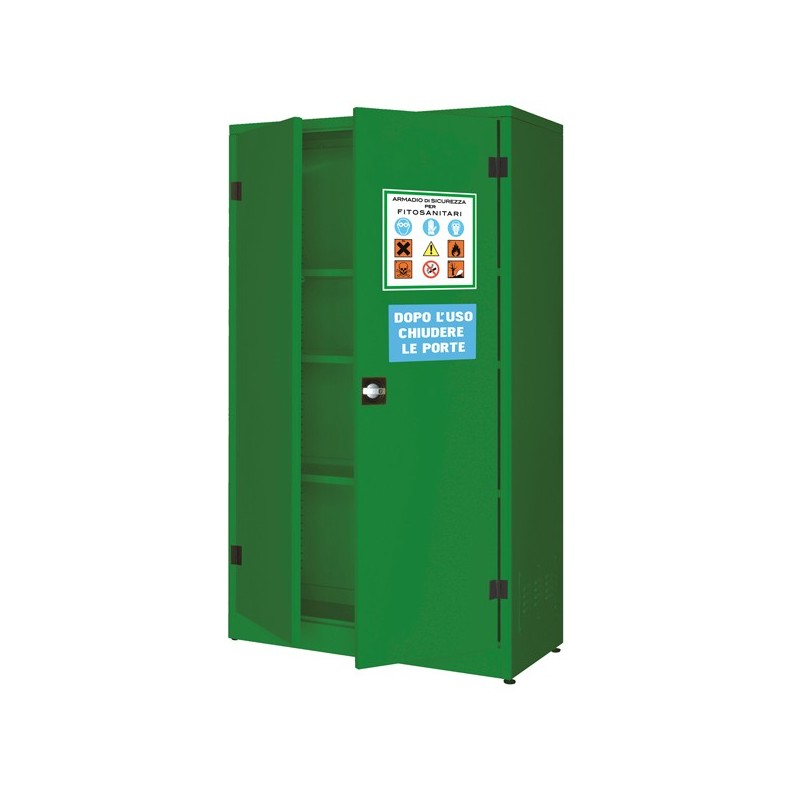 Armadio di sicurezza componibile per lo stoccaggio di prodotti fitosanitari, realizzato in lamiera di acciaio al carbonio P02 spessore 10/10, pre-trattata con fosfosgrassaggio in tunnel ad alte temperature, verniciatura in epossipoliestere colore VERDE e cottura in galleria termica 180°. Dotato di ripiani di contenimento regolabili in altezza e vasca di raccolta a tenuta stagna sul fondo con guarnizioni in gomma, n. 2 griglie di areazione laterali e una posizionata sul tetto con sistema tagliafiamma appositamente studiate per il ricircolo dell’aria o per l’aspirazione forzata. Spigolo arrotondato, robuste cerniere in zama spessore 6 mm, cavo di messa a terra, piedini regolabili, serratura ergonomica in plastica e alluminio con doppia chiave completa di chiusura ad asta con carter copriaste