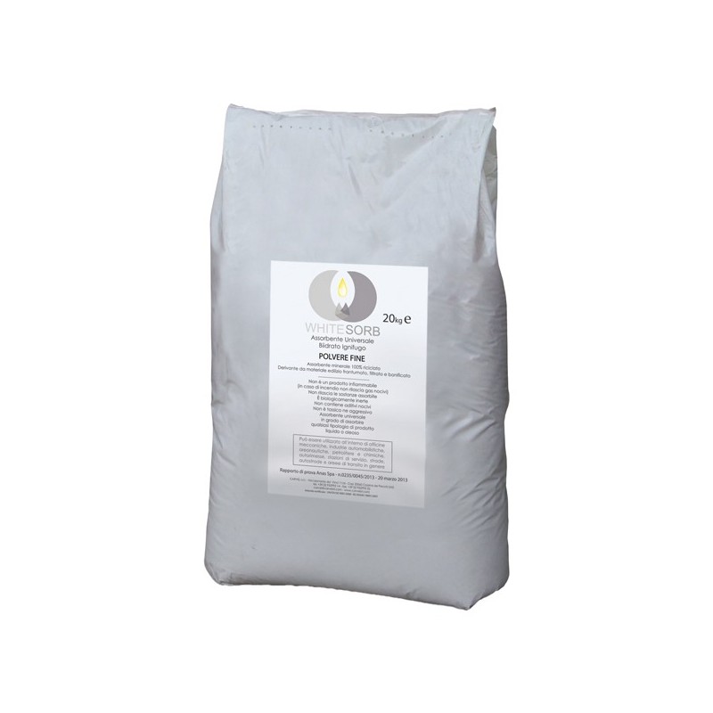 GRANULARE ASSORBENTE UNIVERSALE BIIDRATO IGNIFUGO MINERALE 100% - WHITE SORB è un assorbente minerale 100% riciclato derivante da materiale edilizio opportunamente frantumato, filtrato e bonificato; in quanto materiale minerale non è un prodotto infiammabile ( di conseguenza in caso di incendio non rilascia gas nocivi). È un assorbente universale in grado di assorbire qualsiasi tipologia di prodotto liquido o oleoso. Grazie alla sua caratteristica universale, può essere utilizzato all’interno di officine meccaniche, industrie automobilistiche, areonautiche, petrolifere e chimiche, autorimesse, stazioni di servizio, strade, autostrade e aree di transito in genere. WHITE SORB essendo prodotto con gesso agglomerato, assorbe fino al cuore del granulo ed in più una volta schiacciato tende a diventare polvere aumentando il fenomeno di “grip”, quindi maggior sicurezza antiscivolo. Non rilascia nel tempo la sostanza assorbita; Biologicamente e chimicamente inerte. È prodotto ecologico, non provoca danni all’ambiente; Ha durata illimitata se stoccato in luogo asciutto; IMPIEGO: Utilizzare il prodotto coprendo la zona da bonificare in modo uniforme, in modo che la superficie del materiale inizi la procedura di assorbimento dell’inquinante fino all’assorbimento completo. Dopo l’utilizzo lo smaltimento deve seguire le stesse norme previste dalla sostanza assorbita. DATI TECNICI: - tipologia: granuolo medio - pezzatura: 3 -6 mm - Colore: bianco grigiastro - Aspetto: frantumato - Potere assorbente per sacco: 34lt