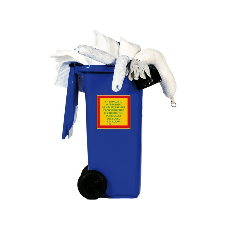 Kit di pronto intervento in contenitore carrellato da 120 lt. adatti per le industrie, aziende di trasporti, aeroporti, ferrovie, vigili del fuoco, scali marittimi, autostrade, aziende per la nettezza urbana. Confezionati in modo da soddisfare le problematiche di disinquinamento.Le nuove normative nazionali e comunitarie, riguardanti la sicurezza e la prevenzione sul lavoro, prevedono che vengano dislocati kit di pronto intervento per arginare ed assorbire eventuali fuoriuscite di liquidi pericolosi. Dimensioni: 48x56x93,5cm. Assorbimento minimo: 158lt. Contenuto: 50 panni 41x46cm; 6 cuscini 46x46cm; 12 calze ø7,6x122 cm; 1 kit protect.