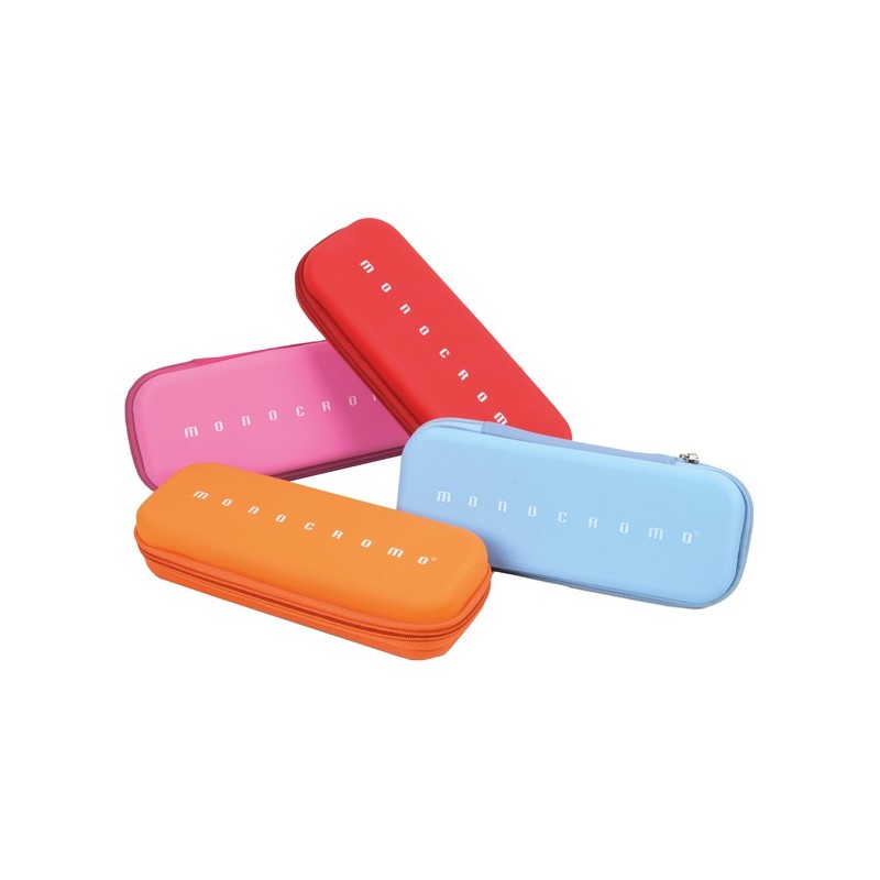 Astuccio rettangolare in silicone. Dotato di zip colorato, scompartimento porta oggetti e retro lunguetta portapenne con alloggio. In 4 colori assortiti (azzurro, arancione, corallo e fucsia) Dimensione: 12x20cm.