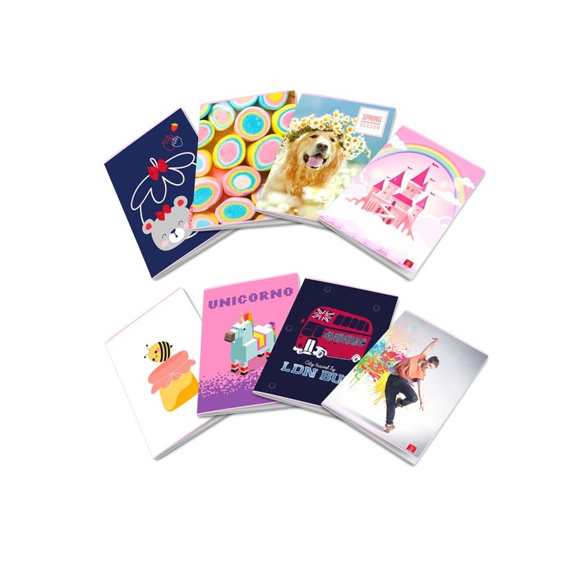 Maxiquaderno rilegato con punto metallico. Copertina in cartoncino da 205gr verniciatura UV. Risguardo personalizzabile stampato fronte e retro. Fantasie assortite 2023.