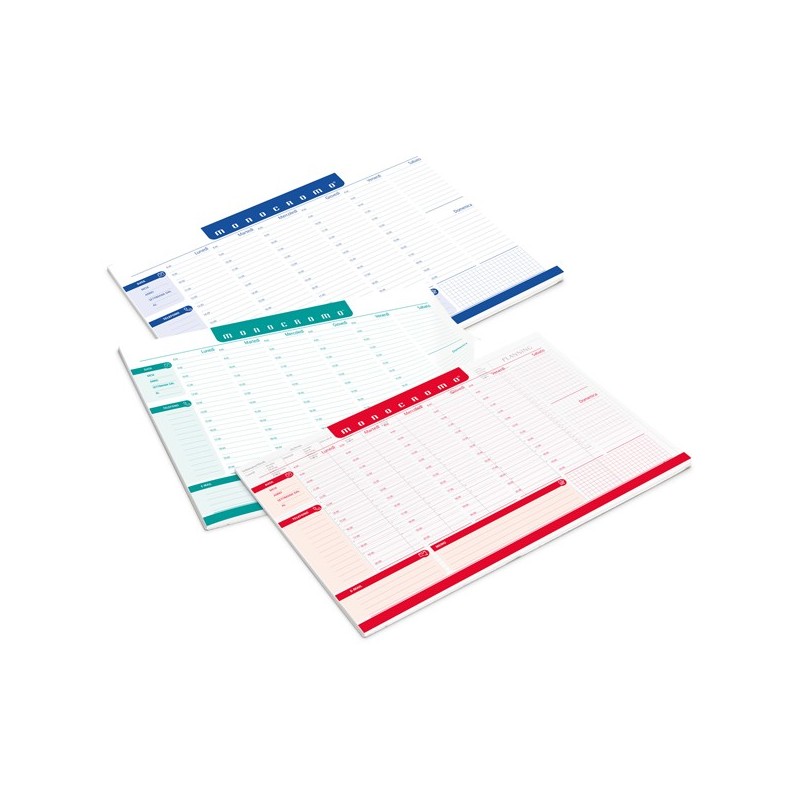 Desk planner settimanale da scrivania. Realizzato in carta da 80gr, 60 fogli. Colori assortiti (rosso/verde/blu).