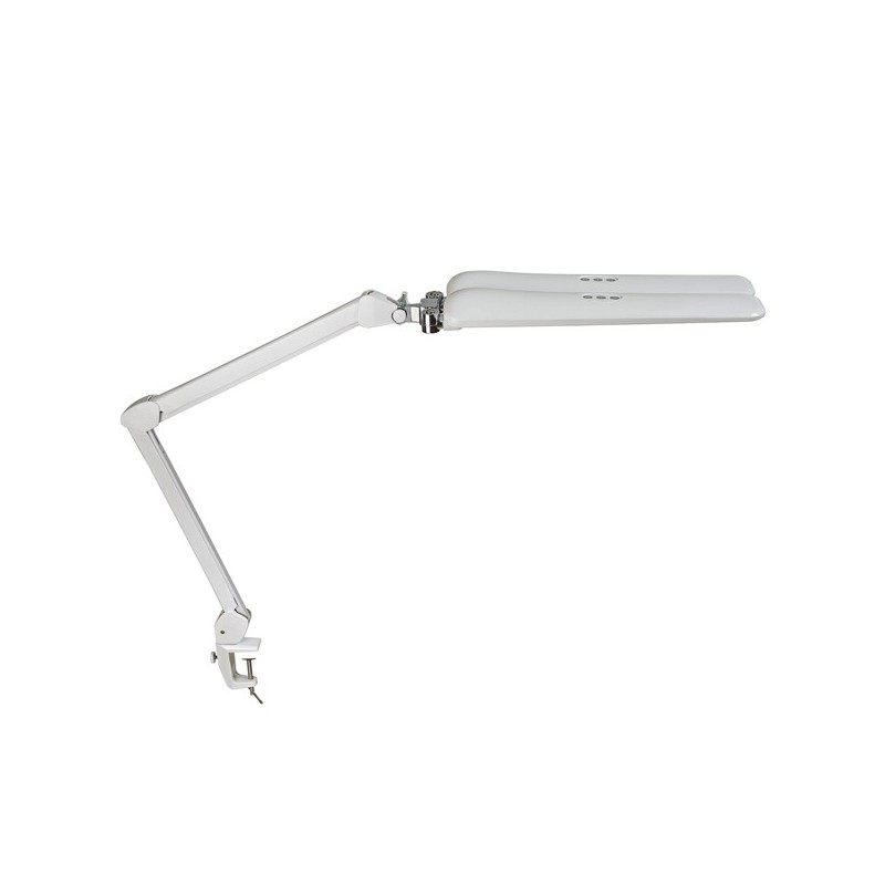Lampada a LED con due teste di lampada e morsetto da tavolo. Bianco con superficie lucida è dotata di due teste di lampada, che insieme producono un elevato illuminamento. Il pratico morsetto da tavolo consente di fissare MAULcraft duo a tavoli e scaffali. L'intervallo di serraggio è di 1-6,3 cm. Il robusto braccio metallico con molla interna e le due teste della lampada possono essere ruotati e inclinati. Le teste possono essere regolate con un angolo compreso tra 0° e 180°. Con un'impostazione angolare di 180°, la postazione di lavoro può essere illuminata fino a un metro di distanza. Dimmerabile tramite campo touch sulle due teste.