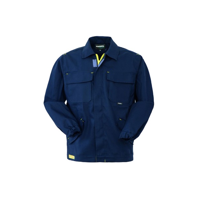 Giubbetto da lavoro con chiusura anteriore con cerniera centrale coperta da patella chiusa con punti velcro. Due taschini applicati al petto chiusi con aletta e velcro, due tasche inferiori a filetto con apertura obliqua chiuse con aletta e velcro. Etichetta jacquard con pittogrammi cucita, polsini a fondo manica con elastico, carré posteriore, travette varie di colore giallo.