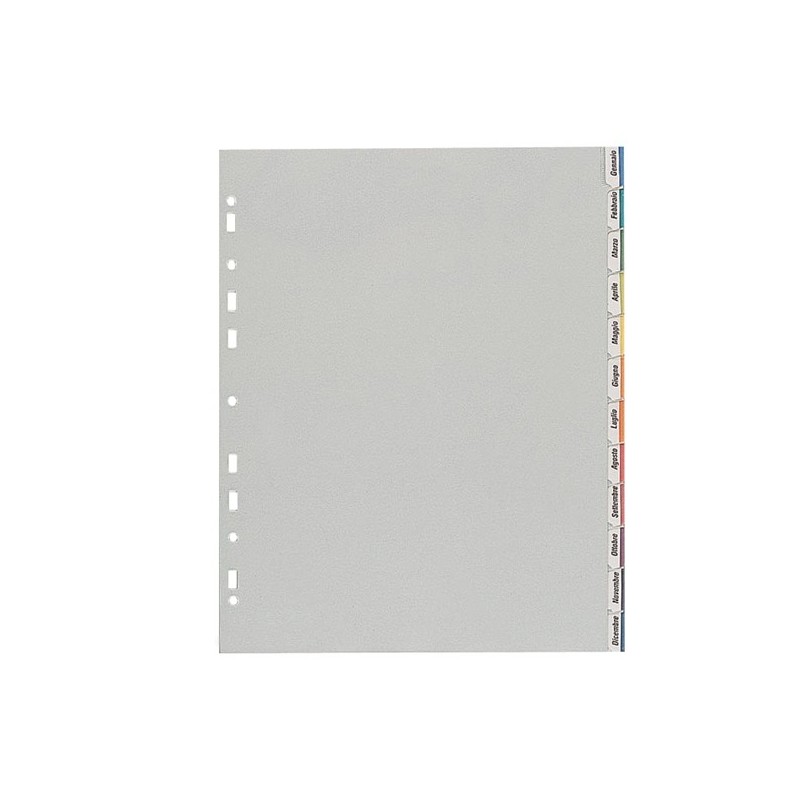 Divisori realizzati in Polipropilene di colore grigio da 120micron. Dotati di 12 tacche neutre e di un cartoncino stampato e fustellato per la personalizzazione delle tacche.