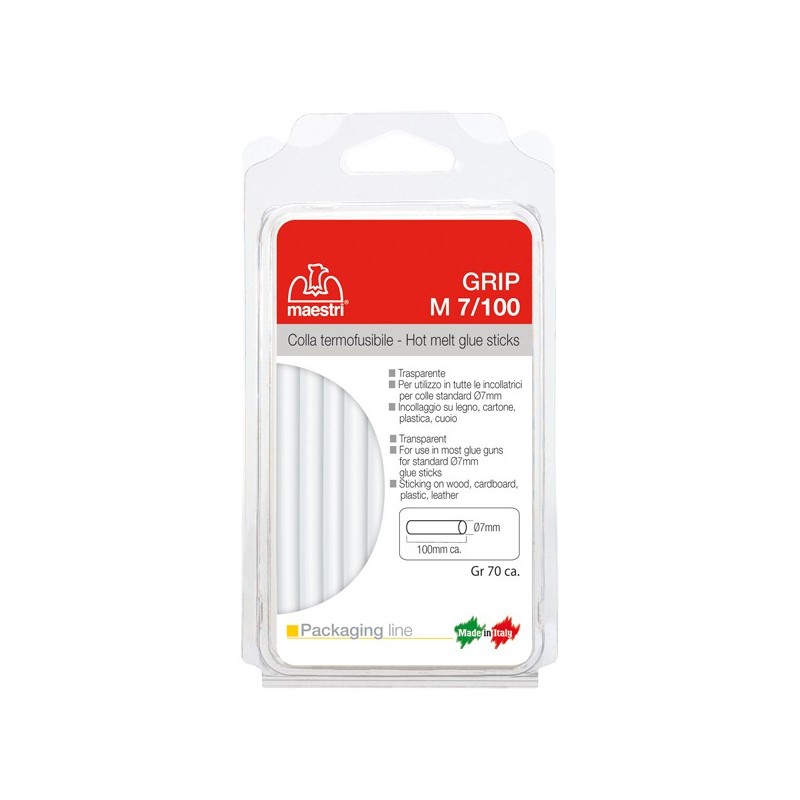 Adesivo termofusibile trasparente utilizzabile in tutte le incollatrici ø 7 mm. Stick confezionati in blister da 70 grammi ca. (N° 18 stick). La M7/100 è un adesivo termo fondente caratterizzato da un’elevata rapidità di presa ed un tempo aperto medio-lungo, presenta un film collante flessibile e tenace. Viene generalmente utilizzato nel settore della calzatura e in cartotecnica per incollare cartone, legno ceramica, stoffa, materie plastiche ecc. Certificazioni: REACH (CE) N° 1907/2006 - Direttiva 94/62/CE.
