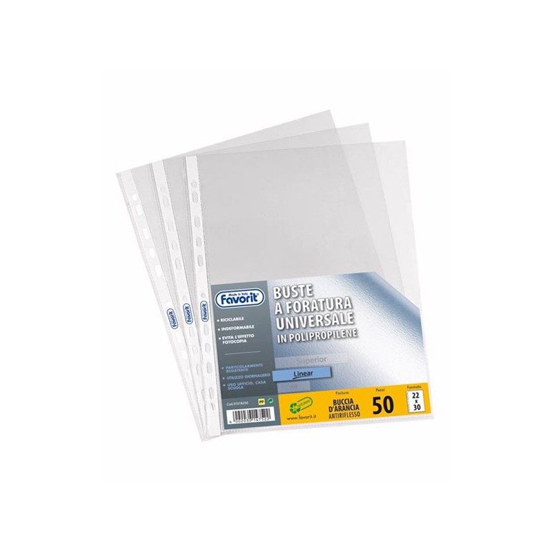 Buste forate realizzate in Naturene (polipropilene) trasparente buccia con foratura universale. Tipologia linear 22x30cm. Confezione da 50 buste. Made in Italy