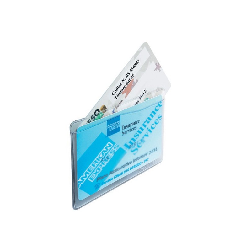 Buste salva cards in Pvc semitrasparente a 3 strati, con 2 tasche contrapposte. Formato utile 8,5x5,4cm. Confezione da 50. Made in Italy