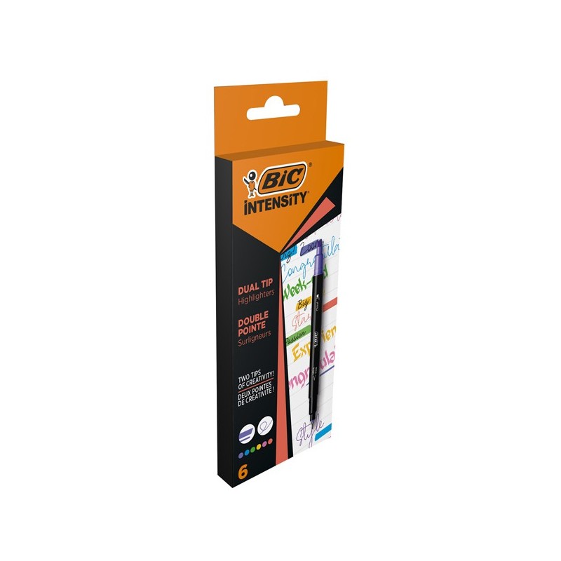Un assortimento di 6 pennarelli BIC Intensity Dual Tip che combinano una punta a pennello morbida su un'estremità e una punta sottile sull'altra. La punta a pennello è ideale per regolare lo spessore per colorare grandi superfici o creare delicate calligrafie. La punta sottile crea linee medie da 0,5 mm per scrivere o colorare i dettagli più piccoli. L'inchiostro luminoso e vivido a base d'acqua è in una varietà di colori rainbow (rosso, rosa, blu, verde, giallo e nero).