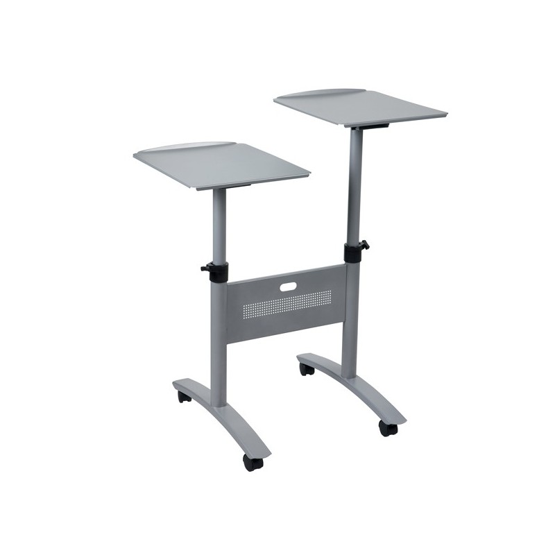 Resistente carrello per proiezione multimediale in metallo dotato di due piattaforme distinte: una per il notebook e l'altra per il proiettore. Entrambe si inclinano e ruotano di 360° per ottenere l' angolo di presentazione migliore. Ciascuna piattaforma (38x43cm ciascuna) può supportare fino a 10kg e può essere regolata in altezza da 81 a 120cm. 4 ruote orientabili di cui 2 bloccabili.