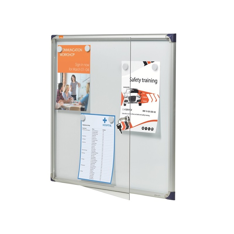 Bacheca extrapiatta per esporre comunicazione in corridoi e passaggi stretti. Cornice in alluminio anodizzato con angoli in colore blu. Anta munita di serratura con due chiavi in dotazione. L'anta si apre con angolo di 135°. Telaio con fondo in metallo bianco brillante. Profondità interna per 11mm. fornita con normali fissaggi per il montaggio a parete. Dimensioni: 81,5x67cm è possibile esporre 6 fogli f.to a4
