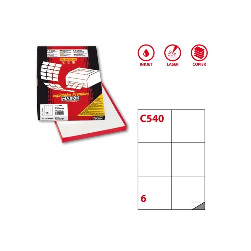 Scatola da 100 fogli di etichette in carta adesiva permanente in formato 21x29,7cm adatti per fotocopiatrici, stampanti laser, inkjet.