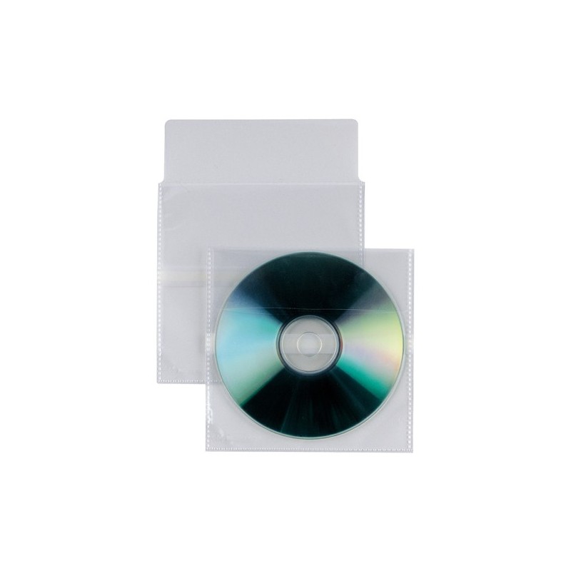 Buste porta CD-DVD in PP liscio con striscia autoadesiva sul retro e patella di chiusura per evitare la fuoriuscita accidentale di un CD-DVD. Formato 12.5x12cm.