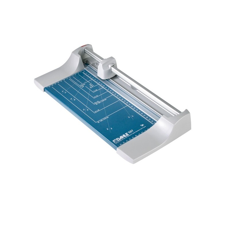 Taglierine Hobby 507 a lama rotante con piano in metallo prestampato con formati DIN, squadre laterali in cm. Lama circolare molata autofilettante e contro lama inferiore molata. Pressino automatico. Piano 440x211mm. Luce di taglio: 320mm (A4). Capacità di taglio:8fogli. Lama di ricambio opzionale: R000985