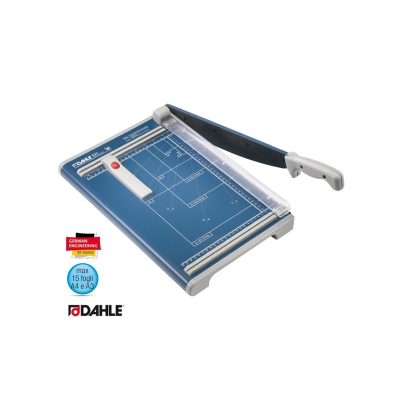 Taglierina a leva con lama superiore e inferiore made in Solingen. Pressino manuale proteggidita. 2 squadre laterali centimetrate. Marginatore posteriore regolabile. Piano stampato con formati DIN e fotografici. Dimensioni piano: 58,5x28,5cm. Luce di taglio 460mm(A3). Capacità di taglio 15fg (1.5mm).