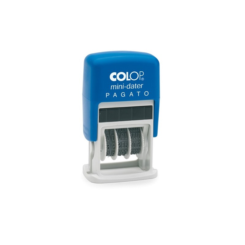 Timbro mini datario con dicitura fissa PAGATO con caratteri alti 4mm. Fusto antiurto in ABS. Tampone preinchiostrato bicolore blu/rosso (cod 38126). Tampone ricambio nero E/10 (cod 38117).
