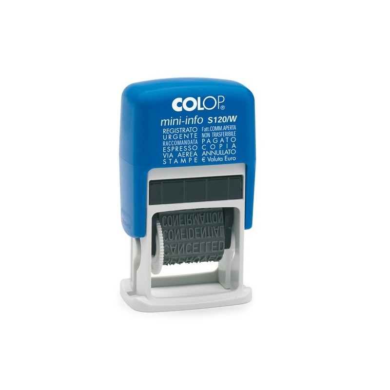 Timbro mini polinomio S120/W autoinchiostrante. 12 diciture con caretteri alti 4mm. REGISTRATO, URGENTE, RACCOMANDATA, RISERVATO, RISP.per E-mail, IMPORTANTE, NON TRASFERIBILE, PAGATO, COPIA, ANNULLATO.